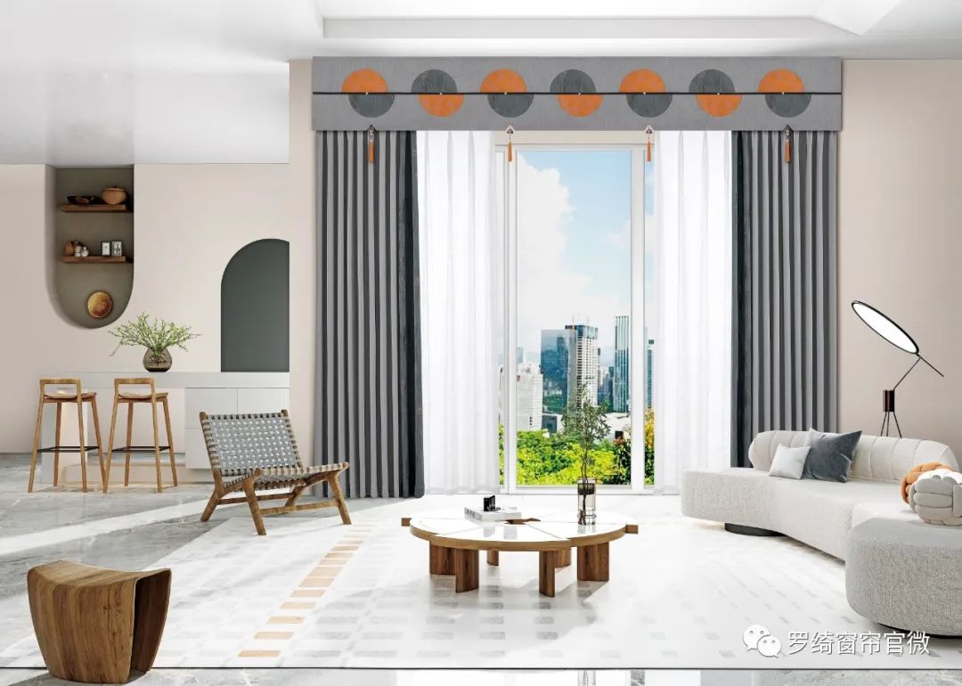 整个窗帘自带一种东方的朦胧美,大面积的深灰色和浅灰色塑造一种淡泊意境。橙色的几处晕染,像极了秋季的惊鸿一瞥。使整个窗帘透露出一种清雅意蕴。包括在细节上的体现,橙色的布料上还搭配着叶片的设计,有一种一叶知秋的画面感。