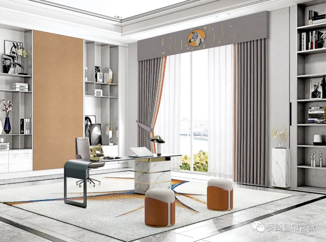 帘头上的造型设计,采用了传统的斑马样式,边上点缀着不规则大小的金色长条圆点等,展现出了空间质感与视觉的冲击力,营造了一种温馨、时尚的轻奢居住环境。马寓意着赤诚,血与火,刚烈,奔驰。