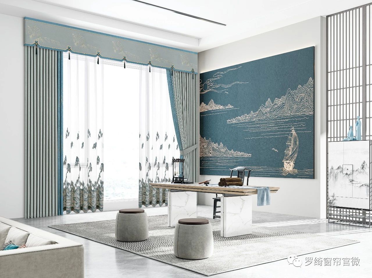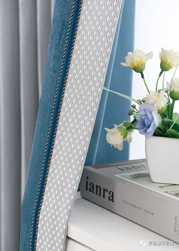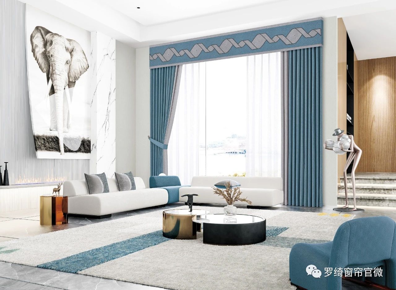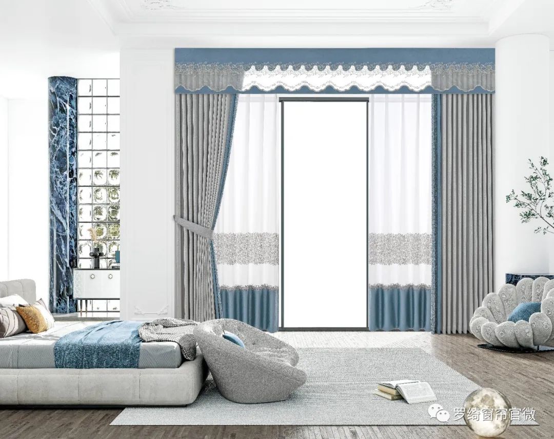 不同的灰蓝搭配比例,就会产生不一样的气场与层次感,接下来先看看灰色作为主布色大面积出现的窗帘搭配。